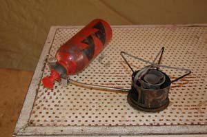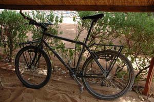Grunden till cykeln är en amerikansk mountainbike från Kona av modellen Lava Dome. Det som fortfarande är original är ramen, styret och sadeln, resten är utbytt, ofta flera gånger. Pakethållarna är av lågbudget som jag fick gratis i Marocko. Dessa är sedan förstärkta genom ett samarbete mellan svetsare i Marocko, Mauritanien och Mali. Frampakethållaren har 5 fästpunkter och den där bak har 7 olika. Detta gör att de blir stabilare och klarar tyngre last och det lär behövas för jag kommer att lasta på 40 liter vatten när jag kommer längre norrut. Hjulen har jag byggt själv. Jag använder Deore XT nav bak med 36 ekerhål och fram använder jag Deore LX med 36 hål. Varför jag valde en svagare modell fram beror på att jag inte lyckades skaffa ett Deore XT framnav med 36 hål utan bara med 32. Ekrarna jag använder är Swiss DT ekrar av stål som är tåliga. Fäljarna är "Ultrastrong LMF" från Planet X och däcken jag använder är "Evolution, Marathon XR" från Schalbe. Dessa lär vara punkteringssäkra, med det stämmer inte i Afrika. Jag får punkteringar regelbundet men däcken håller betydligt bättre än andra modeller jag har testat tidigare. Slangarna till däcken är av olika märken och jag brukar inte bry mig vilket märke jag använder. Växelsystemet är till största delen Shimanos Deore XT men kugghjul, kedja och dylikt är av okänt märke. Cykelväskorna jag använder är World Tramp II och World Cycle II från Vaude och dessa har varit med mig de sista 25 000 km och lär hålla i alla fall 10 000 km till. Jag har även en väska fäst på styret och det är Komet II från Vaude men detta är en stor flopp från Vaude. De har lyckats skapa en icke vattentät väska som öppnas vid stark vind, för knäppningen håller inte. Plastfickan på överdelen, för att förvara kartor, är inte vattentät och blir gul snabbt av solen. Enda som håller bra kvalitet är fästet som är lätt att öppna och håller bra Cykeldatorn jag använder är Sigma Sport 500 och det är en enkel modell som visar total distans, dags distans och tid för dagsdistansen. Den har även en vanligt klocka som jag inte har orkat ställe in. Denna modell räcker fullständigt och var den bästa modell jag kunde finna i Vologda i Ryssland. Tält och sovutrustning Tältet jag använder är Taurus II från Vaude och jag är helt nöjd med det. Börjar för all del bli slitet efter drygt ett års användande. Golvet läcker ordentligt sedan termiter har gnagt många hål men jag försöker undvika område där det regnar. Har ingen sovsäck med mig utan jag använder ett sovsäckslakan av silke från Vaude. KökSom kök använder jag MSR XGK Expedition som är det mest driftsäkra kök jag har testat. Men med dålig bensin, tillsammans med sand, så blir det även problem med detta kök. Kastrullsettet jag använder är från BILTEMA och jag har plockat det från deras spritkök. Fungerar helt utmärkt och är betydligt billigare än de mer kända märkena. Vet för all del inte om själva spritköket fungerar, för det har jag inte testat. Det enda matbestick jag har med mig är en sked av engelskt ursprung.