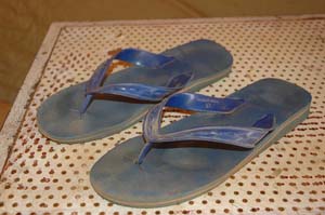 Kläder Jag brukar cykla i sandaler och för tillfället har jag ett par blå av märket Ransford av kinesiskt ursprung. Brukar inte hålla så länge men går att hitta nya överallt och kostar runt 5 kr.